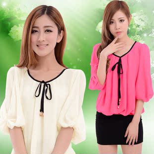 包邮 清凉雪纺衫 女 大码宽松收腰淑女雪纺衫 短袖 韩版雪纺衫 夏