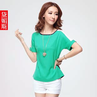 熙雅之尚女装夏装2013新款韩版短袖雪纺衫小衫修身显瘦加大码撞色