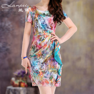 兰佩修身包臀桑蚕丝绸印花大码 大牌修身2013夏季韩版 真丝连衣裙
