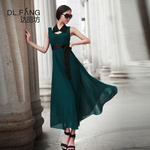 99元包邮 女装夏装新款2013欧美超大摆绿色拖地雪纺连衣裙 长裙
