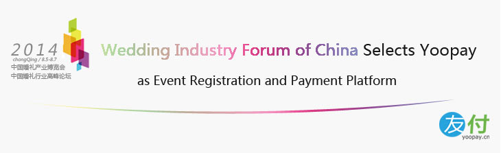 | | | | |  | | About Wedding Industry Forum of China | | | | Wedding is a huge and growing market in China. In 2013, an estimated RMB 200 billion (US$ 30 billion) are spent on weddings and related products and services. | | | Wedding Industry Forum of China, WFC, is the top conference event for wedding professionals in China. The 4th annual WFC was held in August in Chongqing. Hundreds of distinguished industry experts and guest speakers are invited to speak at the conference keynotes and seminars, to share their insights and knowledge about the Wedding Industry with more than 10,000 attendees. | | | Yoopay is seamlessly embedded into the event official website via widget technology, attendees can complete the registration and payment directly on the event website without redirecting, ensuring a better user experience while improving the pre-registration rates. | | | | | | | |  | | About Yoopay | | | | Yoopay.cn is the leading cloud based event online registration, payment, and management platform in China. | | | Yoopay's award winning technology supports: | | 1. Integration with the event's official website 2. Chinese and English dual languages 3. RMB and USD dual currencies 4. All major online payment methods: China UnionPay, Alipay, Visa, Mastercard, Amex, and Paypal | | | More than 20,000 events have been using Yoopay.cn, including brand name events such as Oracle Open World (18,000 attendees, Shanghai), Macworld Asia (15,000 attendees, Beijing) . Other Yoopay client events are: international forums and exhibitions, academic conferences, business events, training events, sporting events, outdoor events, travel events, music events, charity events, alumni club events, and social events. | | | | | | | | | | |