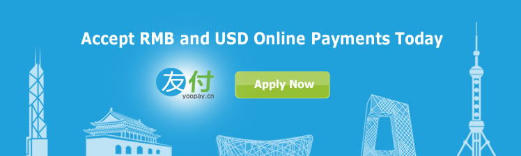 |  | | | RMB | | China Union Pay, Alipay, China Netbank | | | USD | | Visa, Mastercard, American Express, Paypal | | | Works With Any Bank | | take payment instantly in RMB or USD, withdraw funds to any bank in the world | | | Simple Rate | | 3.00 % transaction fee | | | Start in 5 minutes | | no programming skills required use Yoopay directly via web links, or integrate easily into any website or CRM system | | | | | Enable your business in travel, hospitality, education, consulting, professional services,and e-commerce to take payments from 600 million Chinese customers who spent US$ 200 billion last year online | |  | | | | | Have Questions ?