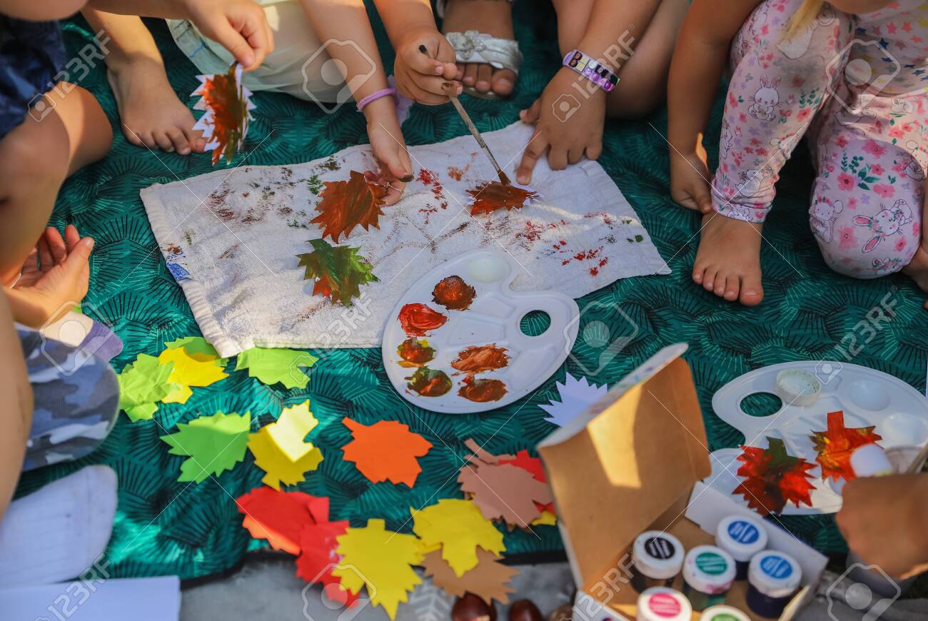 Childrens Art And Craft Of Leaves Made From Paper And Paints Stock Photo, Picture And Royalty Free Image. Image 156820844.